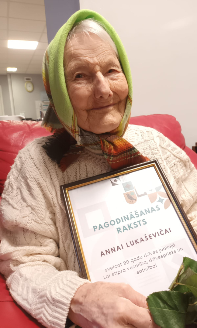 26. janvārī sociālās aprūpes centrā “Aglona” valdīja īpaši svinīga un sirsnīga noskaņa, jo tika atzīmēta Annas Lukaševičas 90 gadu jubileja. Jubilāri sveica radinieki, kaimiņi, kā arī sociālā darbiniece Ārija Perševiča, pasniedzot pašvaldības Pagodināšanas rakstu, kas apliecina cieņu pret viņas dzīves ieguldījumu.